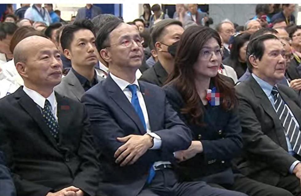 立法机构负责人韩国瑜与马英九、洪秀柱同坐第一排,台北市长蒋万安则坐在第二排,表面上呈现出一派团结景象。